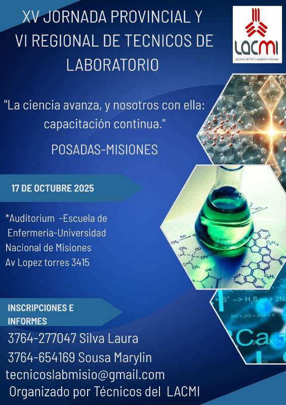 El próximo 17 de octubre se desarrollarán la XV Jornada Provincial y VI Regional de Técnicos de Laboratorio, en el auditórium de la Escuela de Enfermería de la UNaM, organizada por el equipo de Técnicos de Laboratorio del Laboratorio de Alta Complejidad de Misiones (LACMI).