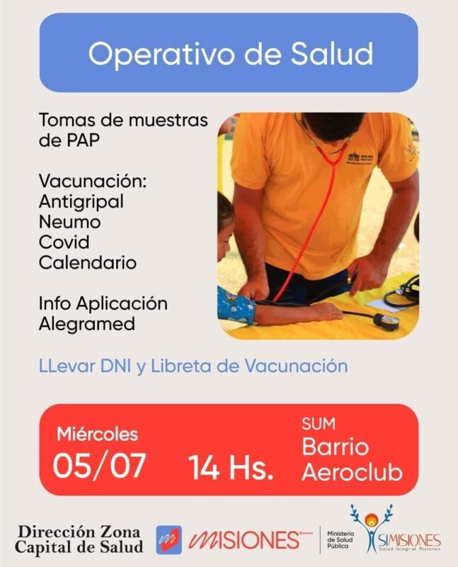 El Ministerio de Salud Pública, a través de la Dirección de la Zona Capital, realizará un operativo de salud en el salón de Usos Múltiples del barrio Aeroclub de Posadas, a partir de las 14 horas, este miércoles 5 de julio.