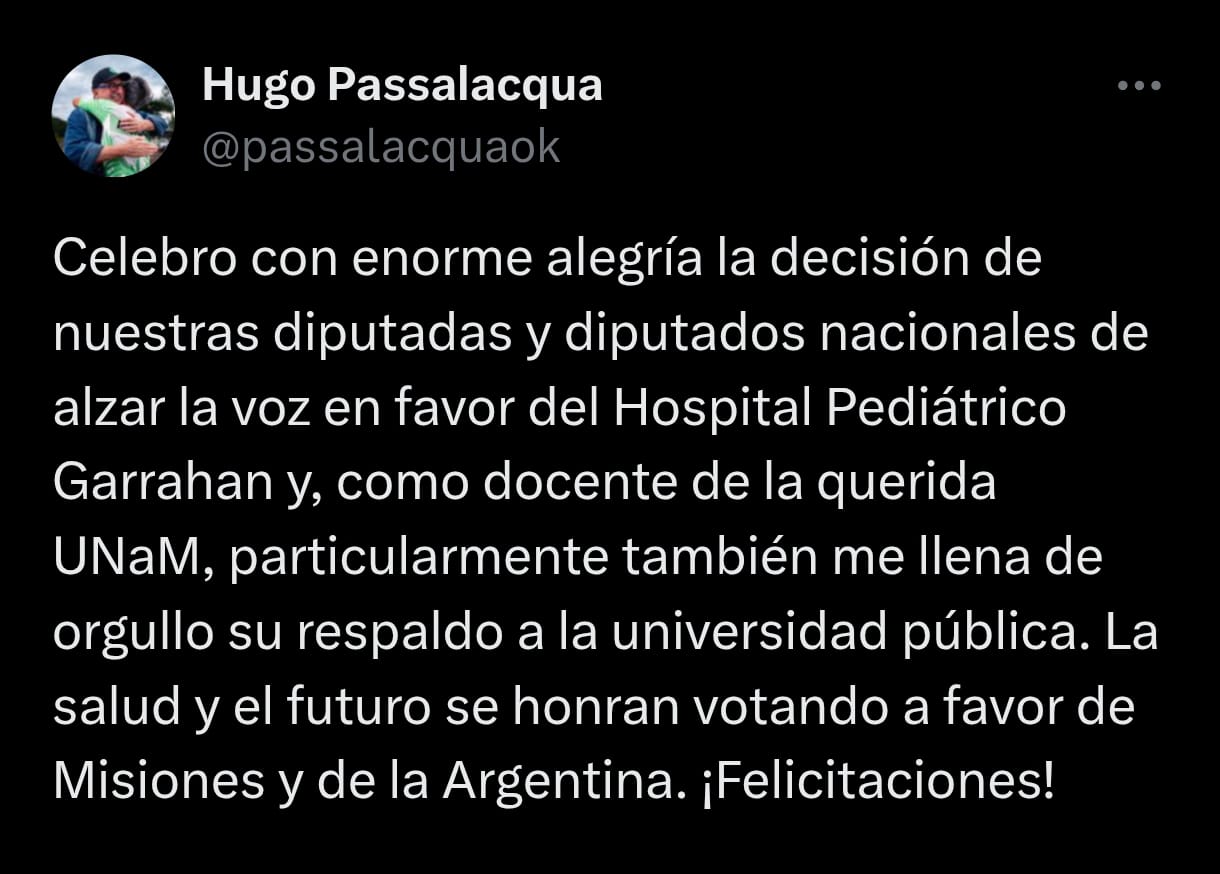 “Celebro con enorme alegría la decisión de nuestras diputadas y diputados nacionales de alzar la voz en favor del Hospital Pediátrico Garrahan y, como docente de la querida UNaM, particularmente también me llena de orgullo su respaldo a la universidad pública”, expresó Passalacqua en sus redes sociales.