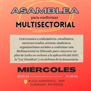 Por ello se invita a referentes, trabajadores, estudiantes, autoconvocados, artistas, sindicatos, organizaciones sociales y a toda persona preocupada con el contexto actual a la Asamblea constitutiva de la Multisectorial a realizarse el miércoles 10 de enero a las 19.30 hs en la Plaza Sarmiento de Eldorado.