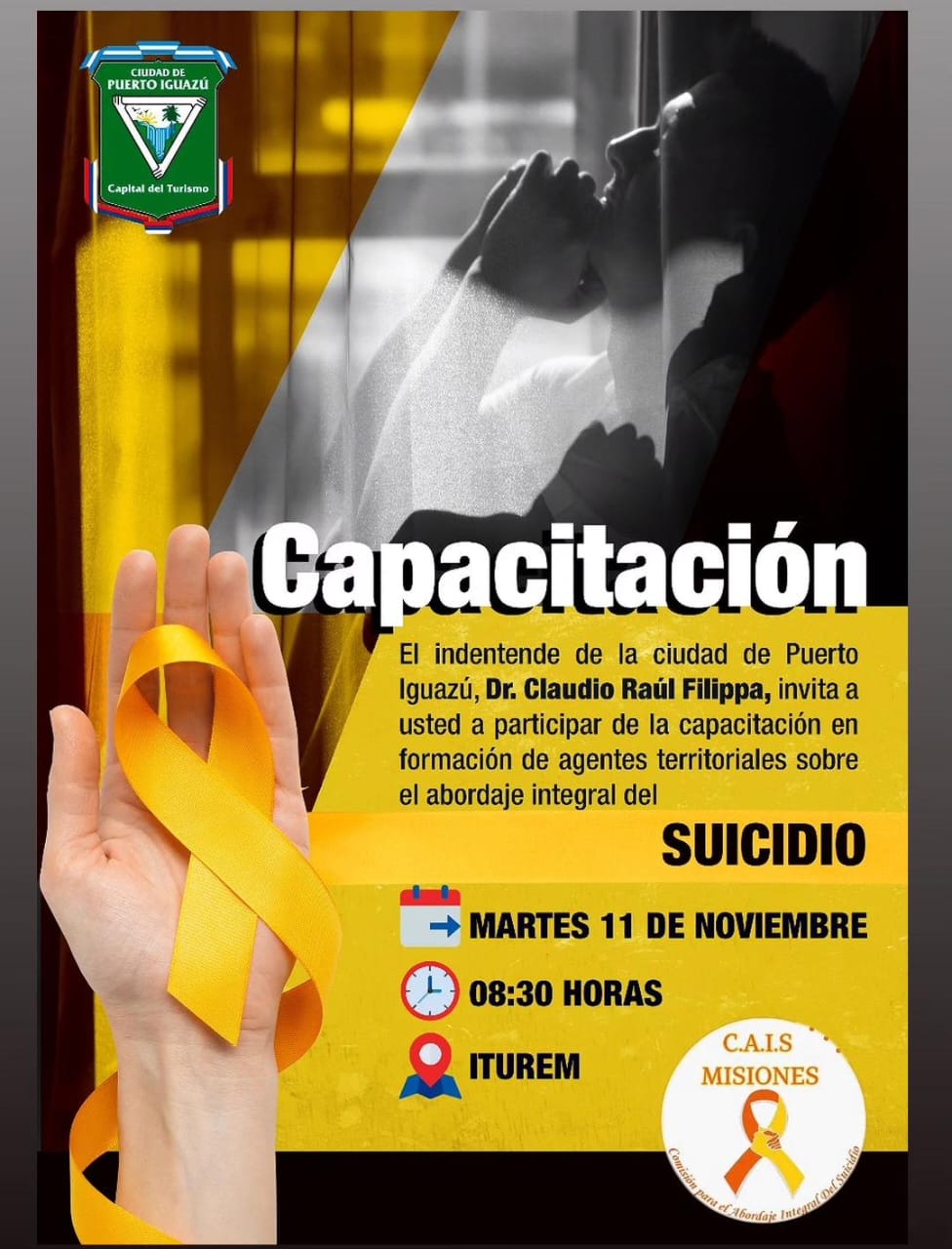 Puerto Iguazú. Mañana martes 11, en la ciudad de Iguazú, se realizará una capacitación para agentes territoriales dictada por la Comisión para el Abordaje Integral del Suicidio, -CAIS- con el objetivo de brindar herramientas y estrategias efectivas para abordar la problemática del suicidio.