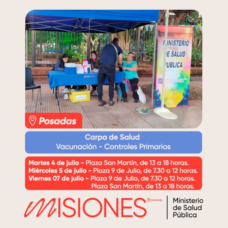 El Ministerio de Salud Pública comunica a los vecinos de Posadas los días y horarios de esta semana, para quienes deseen acercarse a la Carpa de la Salud, y solicitar controles primarios o vacunación.