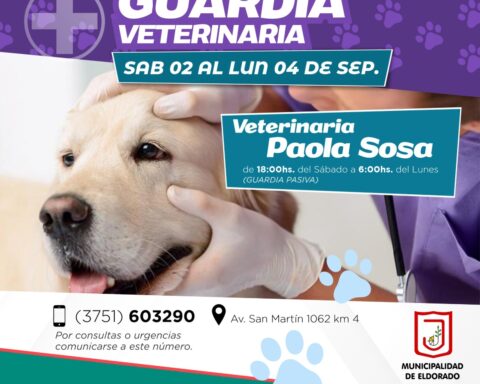 Este fin de semana se encontrará de turno la Veterinaria Sosa. Se recuerda que al ser guardias pasivas, por consultas o urgencias deben comunicarse al 3751- 603290.