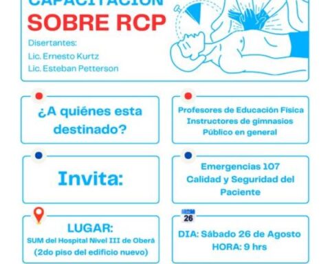 El próximo 26 de agosto en el salón de usos múltiples del Hospital de Nivel III de Oberá a partir de las 9 horas se estará llevando a cabo una jornada de capacitación sobre RCP destinada a profesores de educación física, instructores