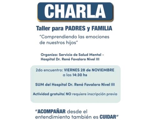 El Servicio de Salud Mental del Hospital Nivel III Dr. René Favaloro invita a la comunidad a participar del segundo encuentro del taller destinado a padres y familias, bajo el lema “Comprendiendo las emociones de nuestros hijos”. La actividad tendrá lugar el