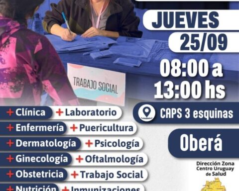 Nuevo operativo de salud integral en Oberá este jueves, 25 de septiembre, de 8 a 13 horas, en el CAPS 3 Esquinas. Dentro de los servicios ofrecidos se encuentran: clínica médica, enfermería, dermatología, ginecología, obstetricia, nutrición, laboratorio, puericultura, odontología, oftalmología, asesorías en trabajo