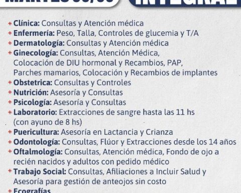 Nuevo operativo de salud integral en Jardín América este martes 9 de septiembre, de 8 a 13 horas, en el CAPS 162 Viviendas del barrio Arroyito. Dentro de los servicios ofrecidos se encuentran: clínica médica, enfermería, dermatología, ginecología, obstetricia, nutrición, laboratorio, puericultura,