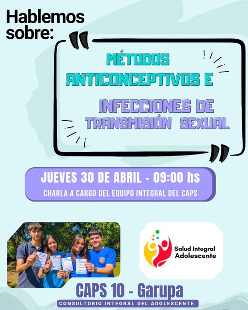 Garupá. Este jueves, a partir de las 9 horas, el equipo interdisciplinario del consultorio adolescente del CAPS Nº10 de Garupá llevará adelante una charla destinada a jóvenes enfocada en el cuidado de la salud sexual.