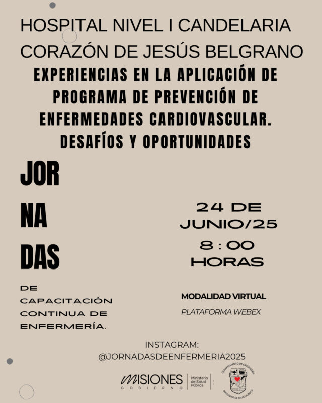 Mañana se dicta el cuarto encuentro del ciclo Capacitación Continua 2025 para Profesionales enfermeros que desempeñan su rol en diversos niveles de complejidad hospitalaria y centros de atención primaria de la provincia. El mismo va a tener lugar en el salón auditórium de la cartera sanitaria a partir de las 8 horas para quienes ya han sido inscriptos para la modalidad presencial y a través del siguiente link para la modalidad virtual https://marandu.webex.com/wbxmjs/joinservice/sites/marandu/meeting/download/5727886c9fad4f81a2fede09e971f291?siteurl=marandu&MTID=m9307423449dce041f717ebcfe1d56e39
