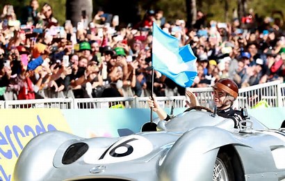 La segunda pasada hizo delirar a la gente: con las clásicas antiparras de lente dividido que usaban los corredores de mediados del siglo XX y una bandera argentina, Franco dio varias vueltas a bordo del Mercedes-Benz W196, una réplica del famoso Flecha de Plata con el que Juan Manuel Fangio ganó los campeonatos mundiales de 1954 y 1955. Resplandeciente, con dos escapes cromados asomándose por el costado derecho, llevaba el #16 en la trompa: el número que usó el quíntuple campeón mundial durante sus carreras más exitosas.__IP__