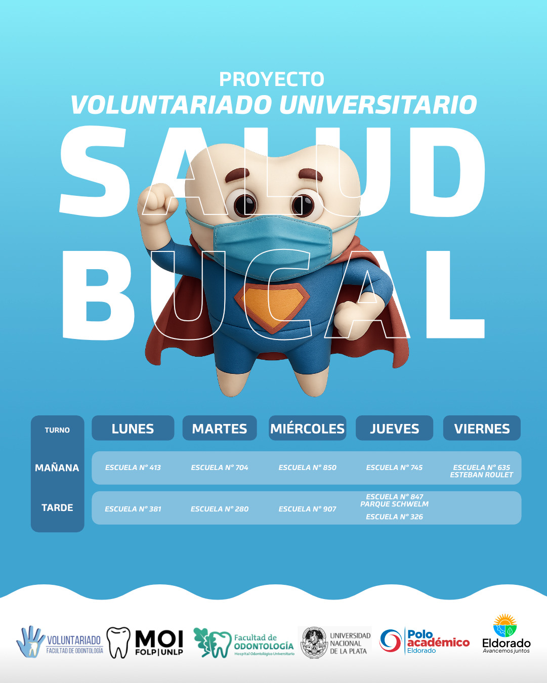 Desde hoy, a partir de las 8:00 hs, estudiantes voluntarios y voluntarias inician sus recorridas desde el Polideportivo del Km 9 hacia distintas escuelas de Eldorado, con el objetivo de promover hábitos de higiene bucal y prevención en la infancia.