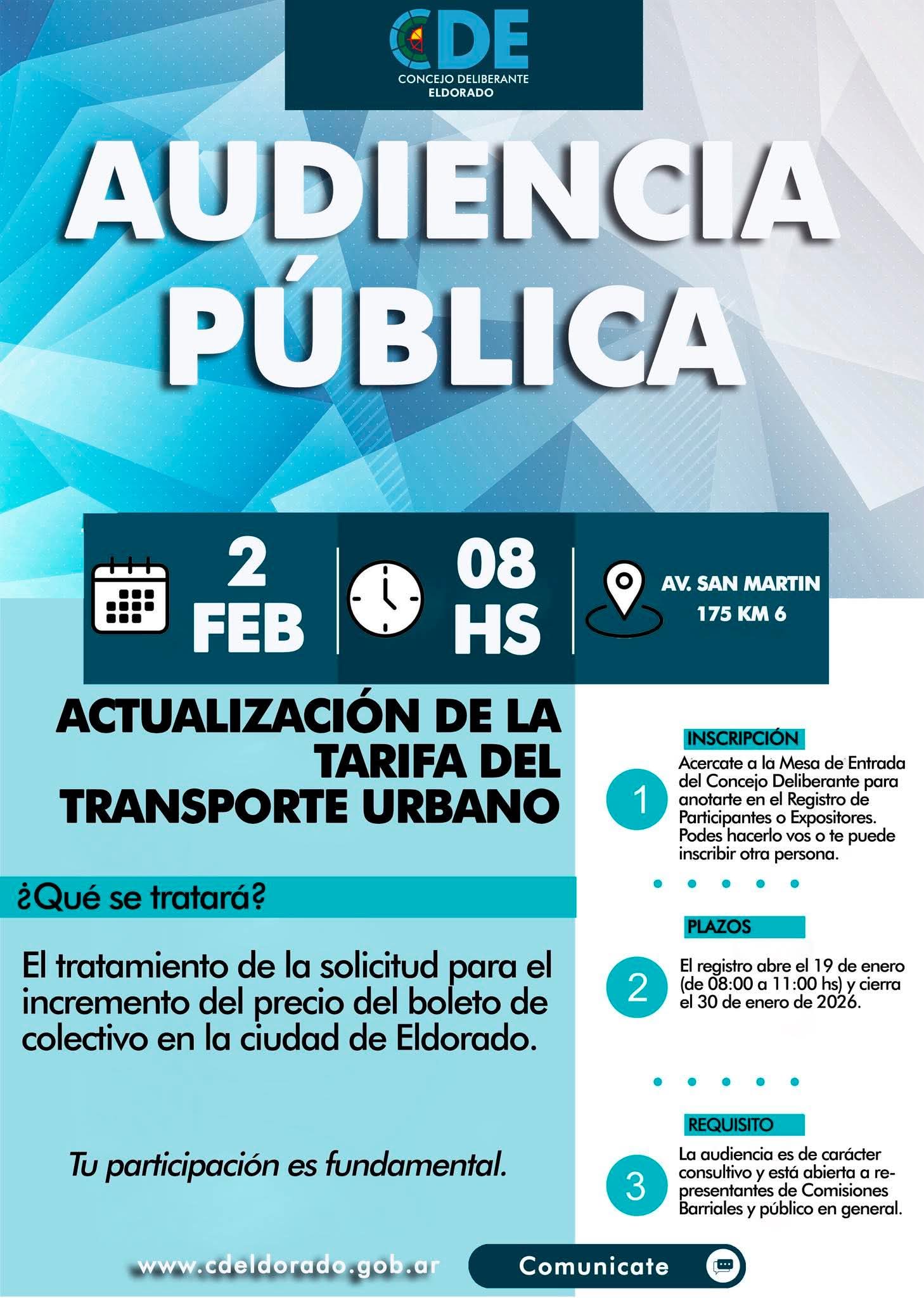 El Concejo Deliberante de Eldorado informó que se llevará a cabo una Audiencia Pública con el objetivo de tratar la solicitud de actualización de la tarifa del transporte urbano en la ciudad.