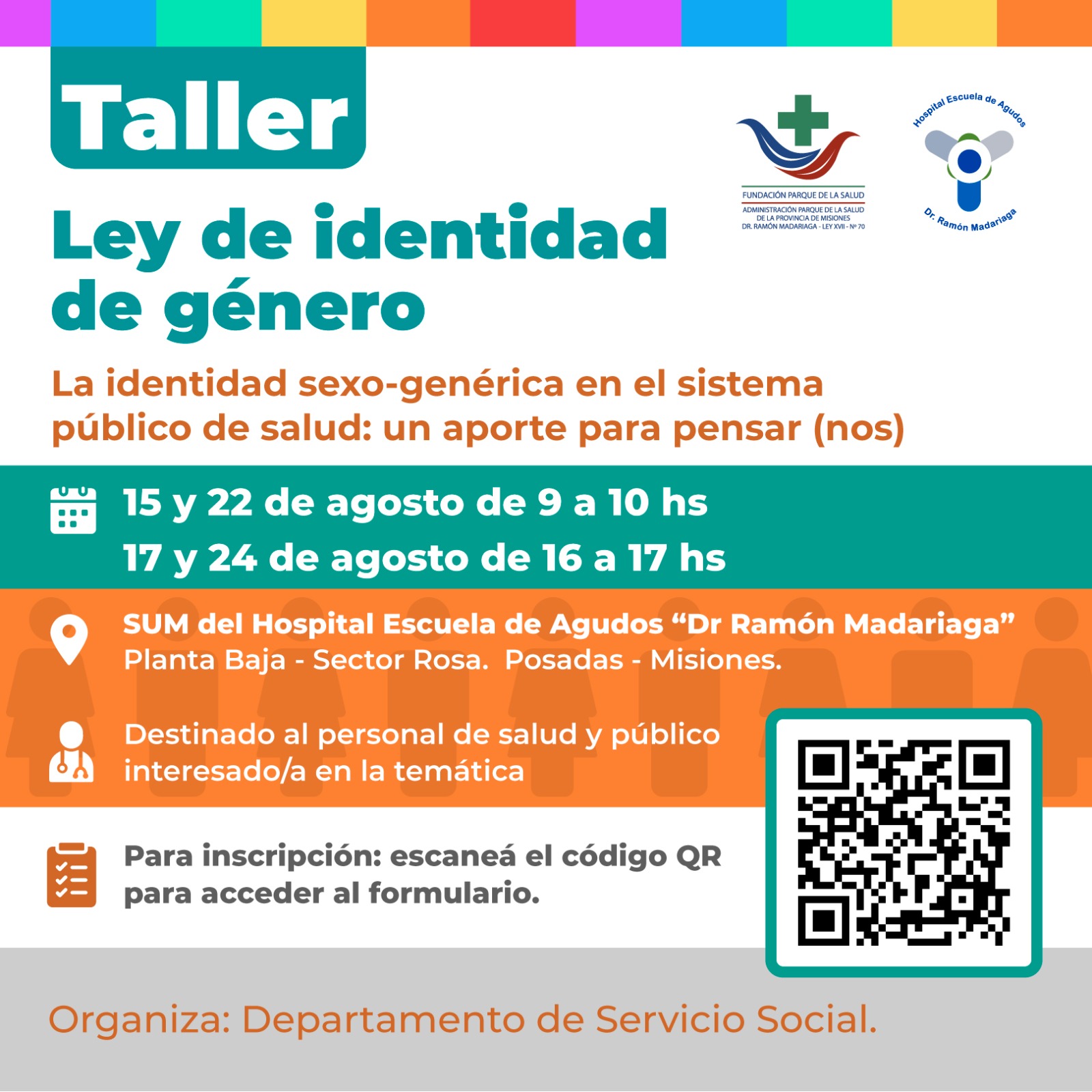 Desde el departamento de Servicio Social del Hospital Escuela de Agudos “Dr. Ramón Madariaga” convocan al taller “La identidad sexo-genérica en el sistema público de salud: un aporte para pensar (nos)”. Se desarrollará durante el mes de agosto y está destinado a todo el personal de salud y público interesado en la temática.