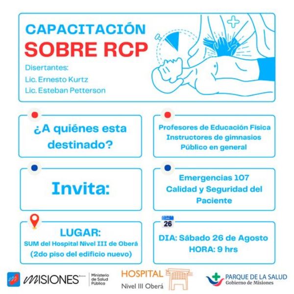 El próximo 26 de agosto en el salón de usos múltiples del Hospital de Nivel III de Oberá a partir de las 9 horas se estará llevando a cabo una jornada de capacitación sobre RCP destinada a profesores de educación física, instructores de gimnasios y público en general.