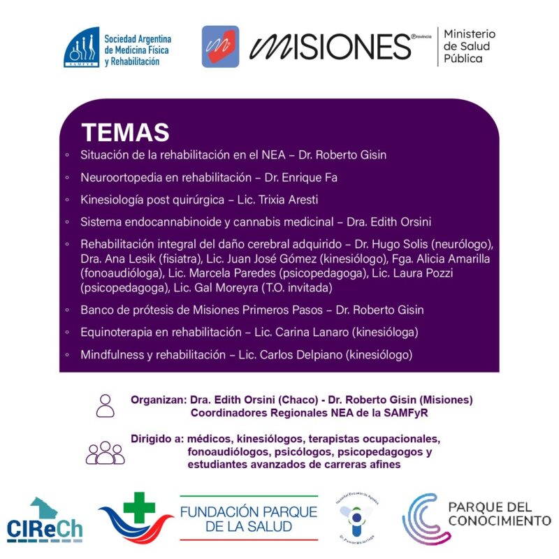 Al tiempo que, detalló información sobre los temas que se trabajarán en el encuentro “están relacionados con situación de rehabilitación en el NEA; neuroortopedia en rehabilitación; kinesiología post quirúrgica; sistema endocannabinoide y cannabis medicinal; rehabilitación integral del daño cerebral adquirido; Banco de Prótesis de Misiones primeros pasos; equinoterapia en rehabilitación; mindfulness y rehabilitación.