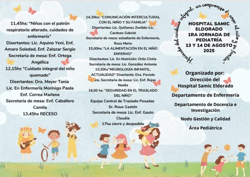 El Hospital SAMIC de Eldorado llevará a cabo la Primera Jornada de Pediatría los días 13 y 14 de agosto, bajo el lema “Haciendo del cuidado integral, un compromiso de amor al niño y su familia”. El evento se desarrollará de forma presencial en el Círculo Médico de Eldorado, ubicado en calle Paraguay 1542, a partir de las 7.30 horas y está dirigido a médicos, licenciados en enfermería, enfermeros, auxiliares y estudiantes de medicina y enfermería.