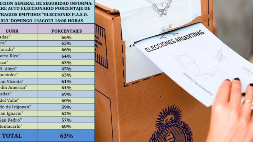Desde la Dirección General de Planeamiento y Estrategia de la Policía de Misiones, revelaron que alrededor de un 63% de los misioneros habilitados para votar, se acercaron a los distintos centros de sufragio para hacerlo.