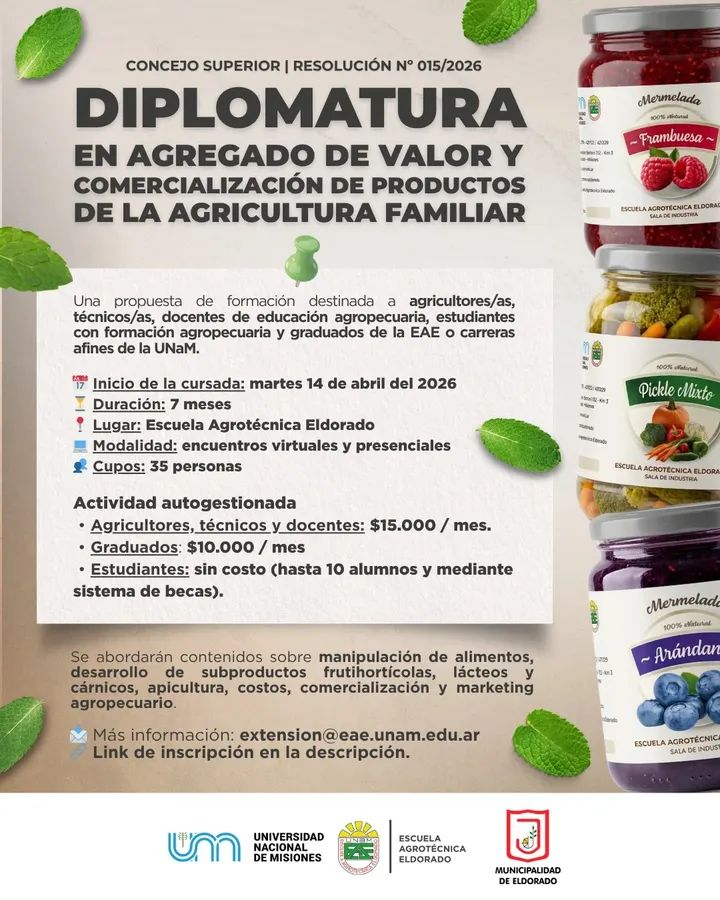 La diplomatura está destinada a agricultores, técnicos, docentes de educación agropecuaria, estudiantes con formación en el área y graduados de la Escuela Agrotécnica Eldorado o de carreras afines de la Universidad Nacional de Misiones (UNaM). La iniciativa busca fortalecer las capacidades productivas y comerciales del sector de la agricultura familiar, promoviendo el agregado de valor y nuevas oportunidades de inserción en el mercado.