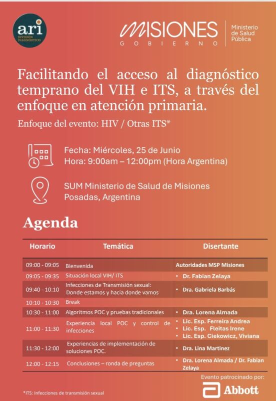 Facilitando el acceso al diagnóstico temprano sobre VIH e ITS, el Ministerio de Salud Pública de Misiones a través de la Dirección de Bioquímica y el Programa ITS, VIH/SIDA y Hepatitis Virales en colaboración con la División de Diagnóstico ARI, desarrollarán un encuentro denominado “Facilitando el acceso al diagnóstico temprano del VIH e ITS, a través del enfoque en la atención primaria”.