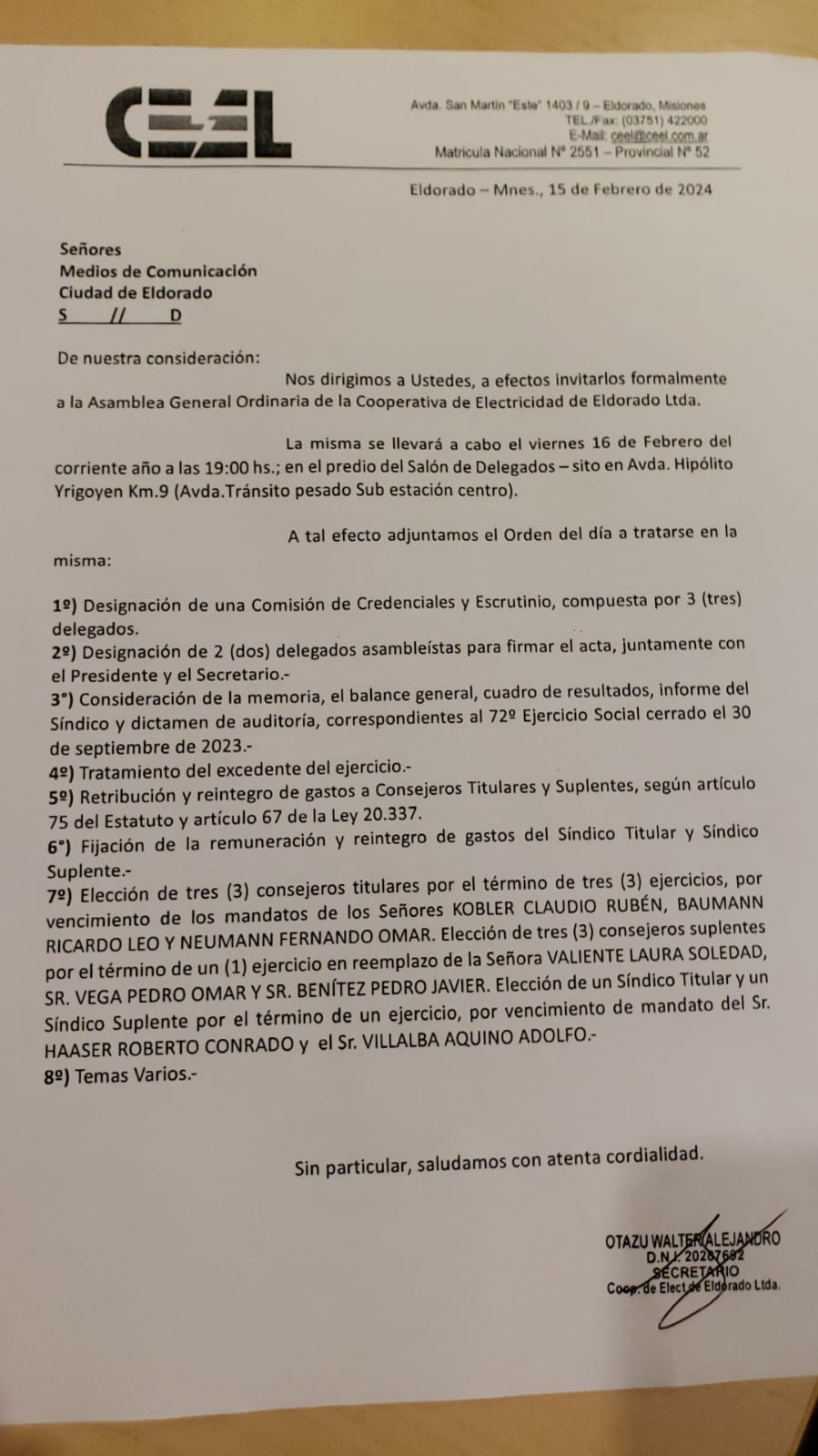 La Asamblea General Ordinaria de la Cooperativa de Electricidad de Eldorado Limitada (Ceel) tratará este viernes la Memoria y Balance del 72 ejercicio de la empresa, y elegirá 3 consejeros titulares y 3 consejeros suplentes para integrar el consejo de administración; y la sindicatura compuesta por un titular y un suplente.