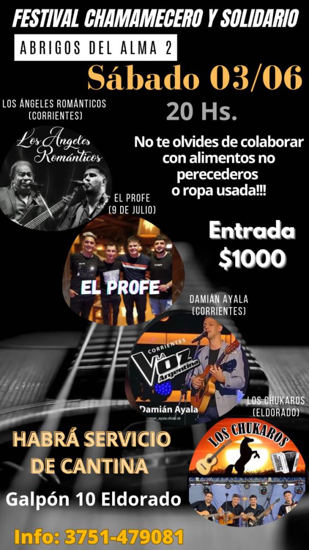 Este sábado 3 de junio en las instalaciones del Galpón 10 de Eldorado se llevará adelante un Festival Chamamecero y Solidario a partir de las 20:00 horas donde además de la participación de artistas locales y provinciales, se contará con las actuaciones especiales de “Los Ángeles Románticos” y Damián Ayala desde la provincia de Corrientes.