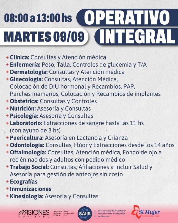 Nuevo operativo de salud integral en Jardín América este martes 9 de septiembre, de 8 a 13 horas, en el CAPS 162 Viviendas del barrio Arroyito.