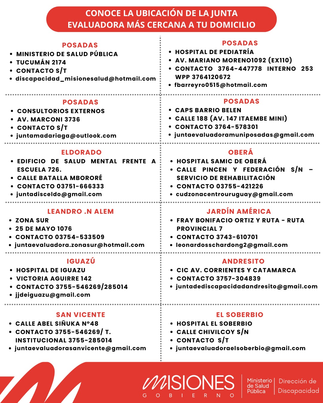 El Ministerio de Salud Pública de Misiones, a través de la Dirección de Discapacidad, recuerda a la comunidad las 12 juntas evaluadoras que funcionan en distintos puntos de la provincia, con el objetivo de acercar la atención y facilitar los trámites a las personas con discapacidad y sus familias.