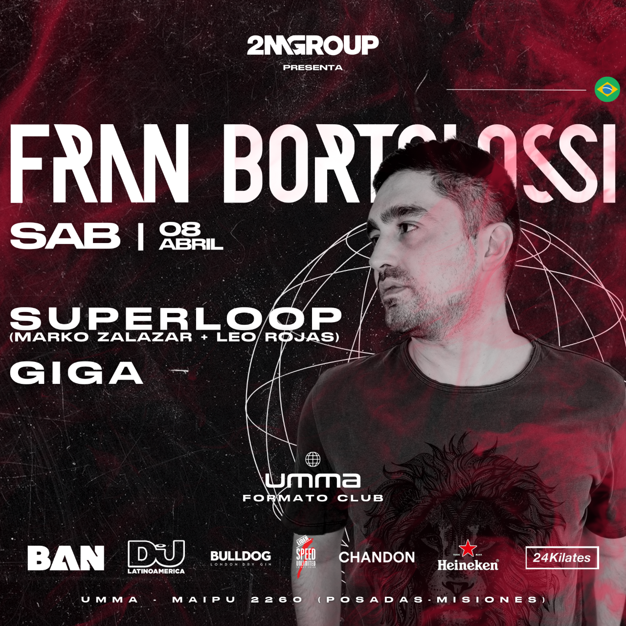 Mientras la crew electrónica de la región se prepara para la llegada del joven productor sevillano, artista de Stereo Booking, “Rafa Barrios”, el club no descansa y propone una jornada para bailar y divertirse. Este sábado la cabina del club electrónico de UMMA (Maipú 2260) recibirá una vez más al joven dj y productor Fran Bortolossi. En esta oportunidad lo acompañan el Dúo más picante de la provincia, los “Superloop”, (dúo musical compuesto por Markos Zalazar y Leo Rojas) abriendo la pista estará GIGA.