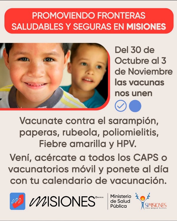 Bajo el lema “La vacunación nos une”, se desarrollará del 30 de octubre al 3 de noviembre en 20 ciudades misioneras la acción Promoviendo Fronteras Saludables, con el fin de garantizar el acceso a la vacunación de las personas que tengan el esquema incompleto de vacunación con especial énfasis en Sarampión, Poliomieli-tis, HPV, Hepatitis B y Fiebre Amarilla.