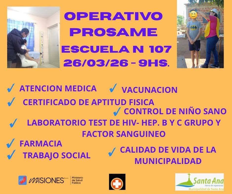El equipo de médicos y agentes sanitarios del Programa PROSAME del Hospital de Santa Ana y del Nivel Central de Posadas estarán visitando a los alumnos de la Escuela N.º 107 (Santa Ana) y la Escuela 857 (Posadas) para realizar controles primarios a la población educativa.