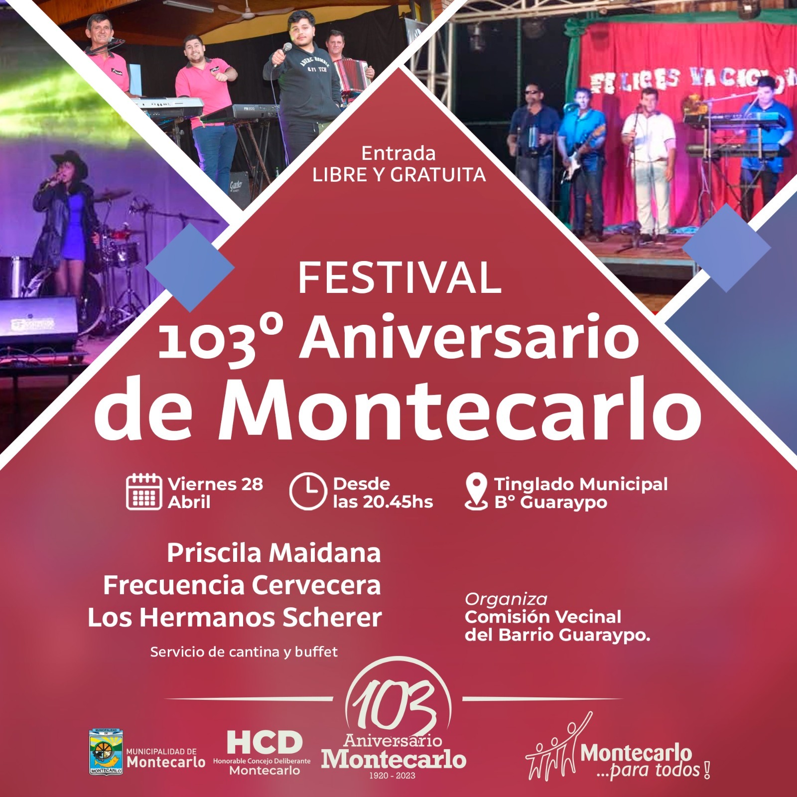 -Festival 103 Aniversario en barrio Guaraypo desde las 20:45 Hs. En el Playón deportivo con la actuación de Priscila Maidana, Frecuencia Cervecera y Los Hermanos Scherer. Entrada libre y gratuita.
