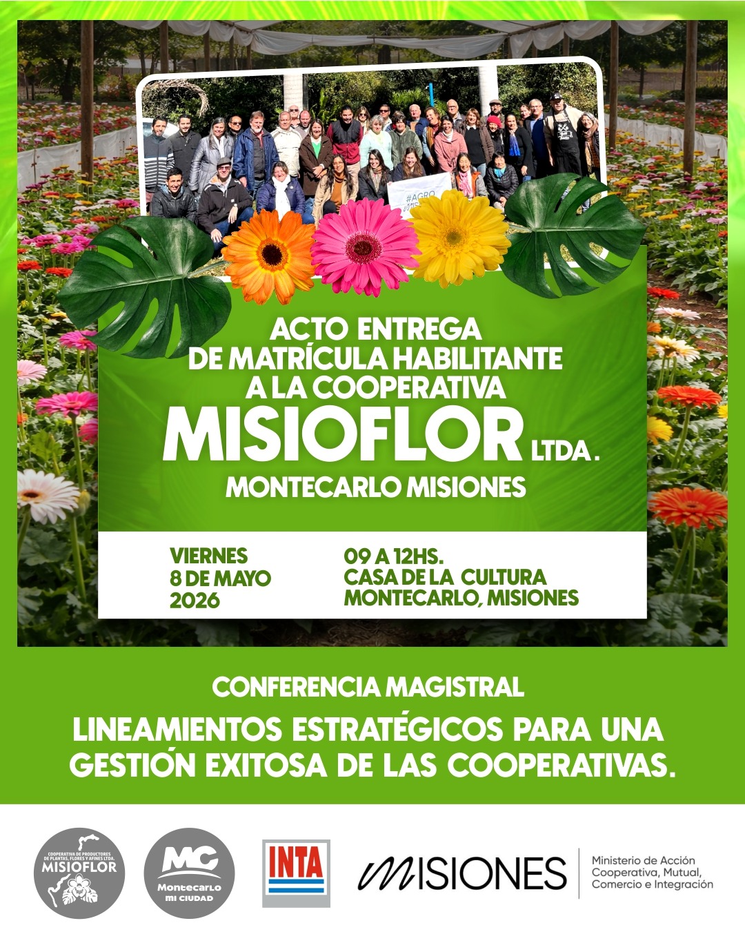 El viernes 8 de mayo, Montecarlo da un paso importante para fortalecer el trabajo colectivo y el desarrollo productivo local , de 9 a 12 hs, en la Casa de la Cultura, se realizará la entrega de la matrícula habilitante a la Cooperativa “MISIOFLOR” Ltda., integrada por productores de plantas y flores de nuestra ciudad. Un logro que refleja organización, esfuerzo y visión de futuro.