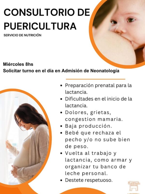 En cada consulta se ofrece apoyo en la lactancia materna, educación prenatal y puerperal, y vuelta al trabajo entre otras cosas. Dicha atención se da los días miércoles a partir de las 8 horas, solicitando turno el mismo día en el servicio de admisión de neonatología.