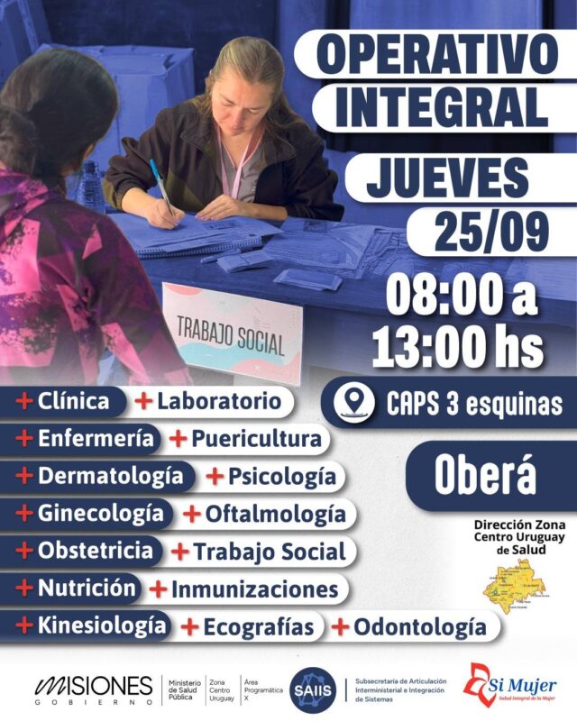 Nuevo operativo de salud integral en Oberá este jueves, 25 de septiembre, de 8 a 13 horas, en el CAPS 3 Esquinas. Dentro de los servicios ofrecidos se encuentran: clínica médica, enfermería, dermatología, ginecología, obstetricia, nutrición, laboratorio, puericultura, odontología, oftalmología, asesorías en trabajo social y servicio de ecografía entre otros.