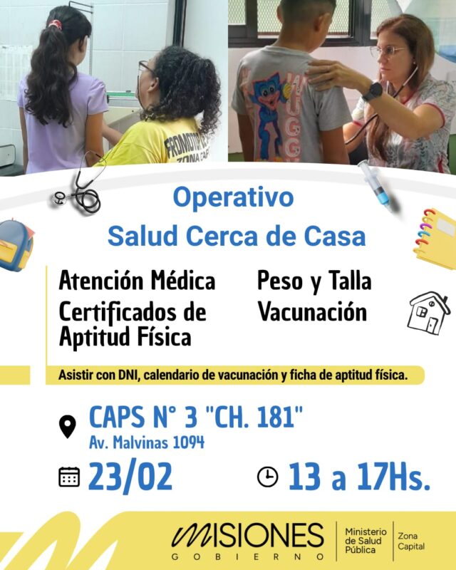 Posadas. La Dirección de la Zona Capital llevará adelante un nuevo operativo de salud el próximo lunes 23 de febrero, de 13 a 17 horas, en el CAPS 3 “Ch. 181” ubicado en Av. Malvinas 1094.