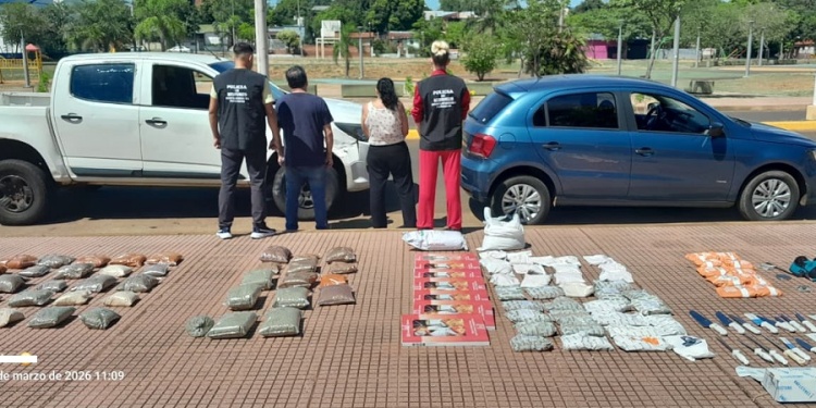 Durante el procedimiento se incautó además una bolsa de arpillera que contenía 42 paquetes de especias, discos y sierras para picar carne, 13 cuchillos carniceros, chairas y teléfonos celulares pertenecientes a los detenidos.