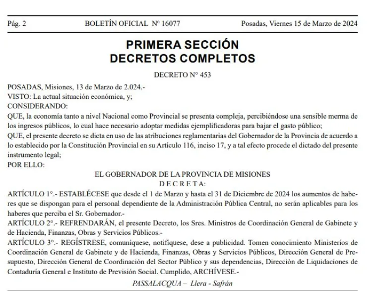 Por lo tanto, la decisión se establece que “desde el 1 de marzo y hasta el 31 de diciembre de 2024 los aumentos de haberes que se dispongan para el personal dependiente de la administración pública central, no serán aplicables para los haberes que perciba el gobernador”. Dicho decreto fue refrendado por los ministros de Coordinación General de Gabinete y de Hacienda, Finanzas, Obras y Servicios Públicos.