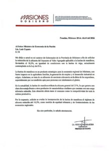 En la carta enviada al funcionario nacional, el mandatario provincial explicó que la medida propuesta busca establecer una equidad tributaria entre productos de características similares. “La harina de mandioca es un producto estratégico para la economía regional de Misiones, con fuerte impacto en la agricultura familiar, la generación de empleo y el desarrollo industrial en origen. Asimismo, se trata de un alimento de creciente relevancia en la dieta de los argentinos, especialmente por su condición apta para personas con intolerancia al gluten”, añadió.