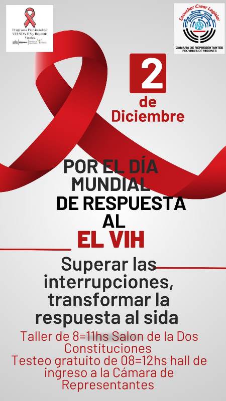 El próximo martes 2 de diciembre, en el marco del Día Mundial de Respuesta del VIH, el Programa Provincial de ITS, VIH/SIDA y Hepatitis Virales del Ministerio de Salud Pública, en articulación con la Cámara de Representantes de la Provincia de Misiones, llevarán adelante una jornada integral de actividades destinada a promover la prevención, el diagnóstico temprano y la concientización comunitaria en relación a la temática.