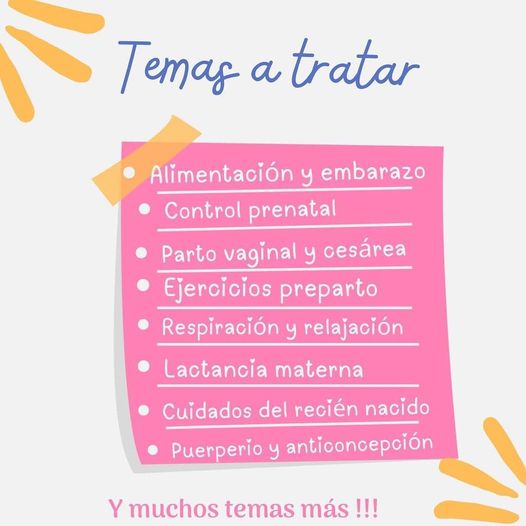 En esta oportunidad, se abordarán los siguientes temas: alimentación y embarazo, control prenatal, parto vaginal y cesárea, ejercicios de preparto, respiración y relajación, lactancia materna, cuidados del recién nacido y puerperio y anticoncepción.