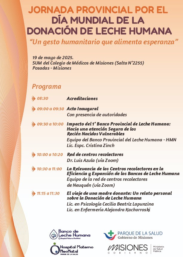 El próximo lunes 19 de mayo, se llevará a cabo la Jornada Provincial por el Día Mundial de la Donación de Leche Humana, organizada y coordinada por el equipo del Banco de Leche Humana del Hospital Materno Neonatal. El encuentro será presencial y estará destinado a profesionales de la salud de toda la provincia, en el SUM del Colegio de Médicos de Misiones (calle Salta 2255, Posadas).