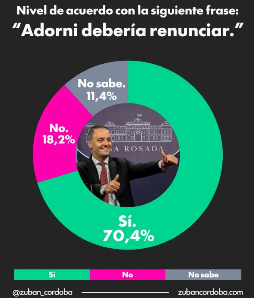 De la encuesta surge, un mensaje mayor al gobierno de La Libertad Avanza y en especial al presidente Javier Milei, es que el “70,4%” de los argentinos está de acuerdo con la frase “Adorni debería renunciar”. Un 11,4% optó por “no sabe” y el 18,2% lo defendió con un “no”.
