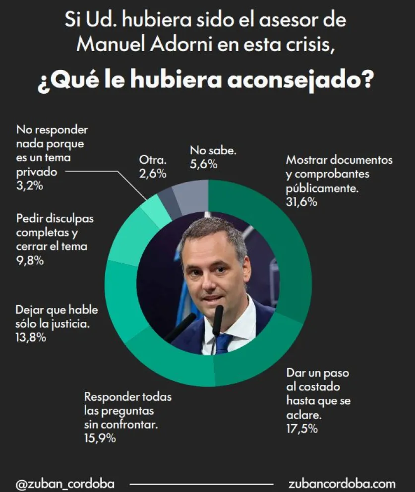 La otra pregunta formulada por la consultora, a cargo de Gustavo Córdoba y Ana Paola Zuban, es “si Usted hubiera sido asesor de Manuel Adorni en esta crisis ¿qué le hubiera aconsejado”, un 31,6% respondió por la opción “mostrar documentos y comprobantes públicamente”, otro 17,5 por ciento planteó “dar un paso al costado hasta que se aclare” la situación; otro 15,9%, responder todas las preguntas sin confrontar; el 13,8%, dejar que hable la justicia; luego un 9,8% “pedir disculpas completas y cerrar el tema” y solo un 3,2% consideró que no debería responder nada “porque es un tema privado”.