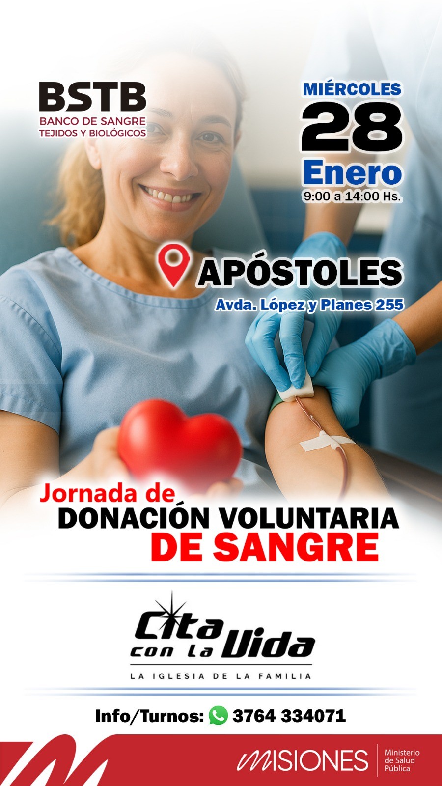 El Banco de Sangre, Tejidos y Biológicos de Misiones proyectó tres colectas externas durante el mes de enero, que se llevarán a cabo en las localidades de Leandro N. Alem, San Vicente y Apóstoles. Además, continúan de lunes a viernes las donaciones en las postas fijas ubicadas en Posadas (Banco de Sangre) y en los hospitales de Nivel III de Oberá y Eldorado.