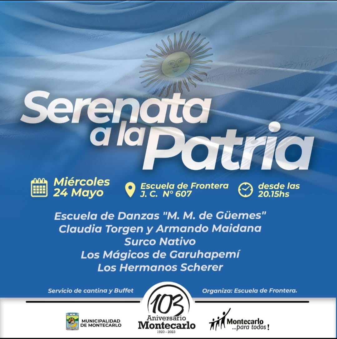 Montecarlo. Como ya es tradicional a lo largo de los últimos años, se realizará este miércoles 24 de mayo, la gran Peña Folklórica denominado “Serenata a la patria” para conmemorar el primer gobierno patrio.